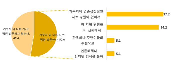 특히, 중증 희귀난치질환의 특성 상 거주지 외 시·도의 병원을 방문한다는 환자가 52.6%로 과반수를 넘었으며, 찾는 지역은 서울 55.4%, 경기 10.5%, 부산 7.5%, 대구 6.4%, 광주 3.9% 순으로 나타났다. 타 지역의 병원을 방문하는 이유로는 거주 지역에 염증성장질환 치료 병원이 없다는 답변이 37.2%를 차지해 대도시 이외 지역의 의료 인프라에 부족함을 느끼고 있음이 확인됐다.