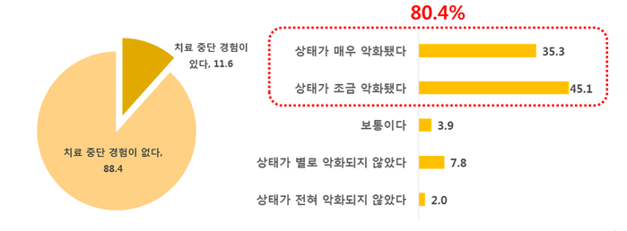환자들의 의료비 부담은 치료의 지연이나 중단으로 이어지는 것으로 조사됐다. 비용 부담으로 인해 치료를 지연하거나 중단했다고 답한 환자가 11.6%에 달했고 이후 상태가 악화되었다고 응답한 경우는 10명 중 8명(80.4%)에 달하는 것으로 나타났다.