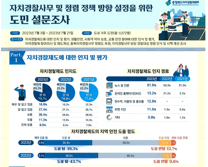 최정훈 의원(청주2)은 ‘자치경찰제 인지도 설문조사’와 관련해 “도민의 79.7%가 자치경찰제를 안다고 대답했지만 이는 ‘보통이다’인 35.4%를 모두 긍정 문항에 합한 값으로 이를 제외하면 44.2%”라며 “이는 작년 44% 대비 0.2%포인트 증가로 사실상 인지도 상승에 실패한 것”이라고 꼬집었다.