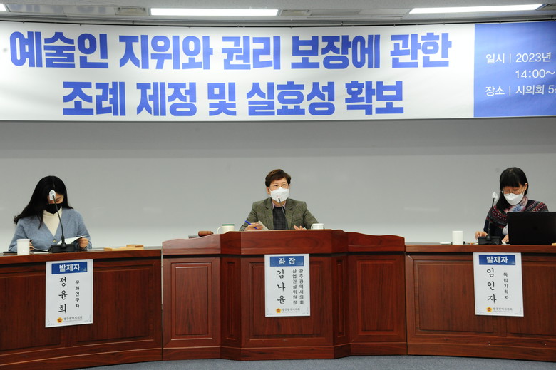 김나윤 시의원을 좌장으로 임인자 독립기획자(광주시 예술인 권리보장 TF 부위원장), 정윤희 문화연구자(前 문체부 예술인 권리보장법 입법추진 TF 위원)가 각각 발제를 맡았다. 김화순 화가(광주여성예술인연대), 김소진 독립큐레이터(시각예술단체 1995Hz 대표), 장도국 배우(광주시 예술인 권리보장 TF 위원), 정종임 광주시 문화도시정책관이 토론자로 참여했다.