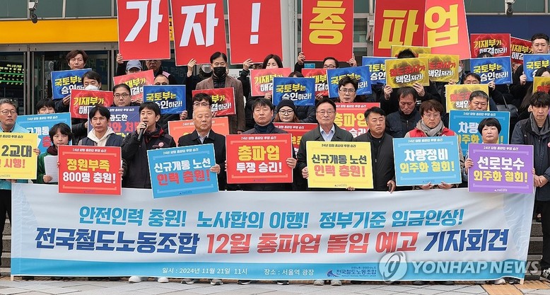 [세계타임즈 = 이장성 기자] 임금인상과 인력 충원 등을 요구하며 준법투쟁(태업) 중인 전국철도노동조합(철도노조)이 12월 5일부로 총파업을 예고했다.철도노조는 21일 서울역 앞에서 기자회견을 열고 "정부와 철도 공사의 입장 변화가 없다면 12월 5일부터 무기한 총파업에 돌입하겠다고 밝혔다.이들은 회견문을 통해 12월 총파업은 불가피한 선택이라며 시민의 안전과 열차의 안전, 정당한 노동을 인정받기 위한 철도노동자의 투쟁은 정당하다고 주장했다.노조는 기본급 2.5% 인상, 노사 합의에 따른 타 공공기관과 동일한 기준의 성과급 지급, 외주화·인력감축 중단, 안전 인력 충원, 4조 2교대 승인, 운전실 감시카메라 시행 중단 등을 요구하고 있다.최명호 노조위원장은 회견에서 철도노조의 요구는 소박하다. 다른 공기업과 동등하게 대우하고, 정부 기준 그대로 기본급 인상하고, 노사 합의 이행하고, 신규 노선 운영에 필요한 인력을 충원하라는 것이라고 말했다.최 위원장은 또 2005년 이후 매년 2명의 노동자가 작업 중 사망하는 현실을 바로잡고, 다른 공공부문 노동자와 동등한 대우를 (할 것을) 요구한다며 위험천만한 안전의 외주화, 인력 감축을 멈춰야 한다고 강조했다.강정남 철도노조 서울지방본부장도 안전이 최우선이라고 하지만, 현실은 정반대라며 한 해 두 명씩 철길에서 목숨을 잃어야 하는 현실에서 노동자의 목숨을 희생시키고 시민의 안전을 위험에 빠트릴 수 없다고 말했다.철도노조는 이날 회견을 시작으로 25일∼28일 전국 주요 역 앞 광장 등에서 지구별 야간 총회를 하고, 26일에는 공공운수노조 공동파업-공동투쟁 기자회견도 열겠다고 밝혔다.