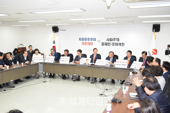 오늘 아침 7시부터 교섭단체 대표 네 사람이 개헌협상과 4월 국회 정상화를 위한 협의를 했다. 야당이 요구하는 방송법과 관련해 민주당은 언제든 협의할 준비가 되어 있다고 우원식 원내대표는 주장 했다. 야당은 민주당이 내놓은 안을 그대로 통과시키겠다는데 무엇을 협의하자고 하는데 도통 알 수가 없다. 정치권 외풍을 차단하고 방송의 독립성과 공정성을 담보해 공영방송을 국민의 품에 돌려드리고자 하는데 그렇다면 민주당이 내놓은 과방위의 방송법은 정치권 외풍에 휘말려 방송의 독립성과 공정성을 훼손하고 공영방송을 국민의 품에서 빼앗는 법안이라는 말씀인지 되묻지 않을 수 없다. 협의에 앞서 방송의 독립성과 공정성을 훼손하는 방송법은 당초 왜 내놓은 것인지 친절히 설명이라도 해주길 바란다. 더 이상 정권잡고 제왕적 대통령 권력으로 공영방송 사장 끌어내고 자기 입맛대로 방송을 장악해서 국민의 알권리를 자기 입맛대로 끌고 갈 심산이 아니라면 다시 한 번 방송법은 민주당 안 그대로 통과시킬테니 더 이상 시간 끄는 꼼수는 부리지 말길 바란다. 개헌문제와 관련해서도 우원식 원내대표는 어제 오늘 투표시기와 권력문제만 협의된다면 다른 부분은 유연성을 가지고 논의할 수 있다고 했다. 기왕 협상에 나서는 마당에 유연성을 가지려면 다 가져야지 왜 굳이 이것만은 양보 못한다고 단서를 다는지 그 태도를 이해할 수 없다. 잘 아시다시피 이번 개헌의 핵심은 제왕적 대통령 권력구조를 종식시켜야 한다는 국민의 뜻과 바람에 의해서 개헌논의가 이뤄지고 있다. 팥소 없는 찐빵 개헌을 위한 형식적인 개헌논의로 올 연초부터 지방분권개헌이라는 슬로건을 내걸고 전국 지자체를 총동원해서 국민들 서명까지 유도하면서 문재인 대통령은 민주당은 뭘 얻었는가. 오로지 6.13 지방선거만 이기면 된다는 식의 ‘개헌정치쇼’를 가지고 개헌장사를 한 것도 하지 않은 것도 없다는 사실이다. 집권당 원내대표 앞세워서 대통령 개헌안 발의해서 사실상 개헌논의 무산시키려 회책하지 말고 교섭단체 원내대표들 청와대 초청해달라. 국민개헌안 합의를 위해서 자유한국당은 선거구제개편를 포함한 국민의 기본권, 사회적 기본권을 포함한 새시대적 헌법을 만드는데 최선의 노력을 다해 협조할 것이다. 대통령은 제왕적 대통령 권력, 지난 작년 5월 19일 문재인 대통령이 한 내용을 다시 한 번 상기시키겠다. 선거구제 개편만 수용되어지면 대통령제가 아닌 다른 권력도 할 수 있다고 분명히 문재인 대통령께서 말씀하셨다. 지금 분권대통령, 책임총리제 하자는데 작년 다르고 올해 다른 문재인 대통령의 입장 분명하게 밝혀주시기 바란다.