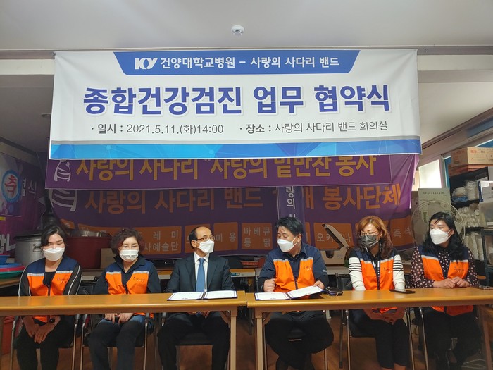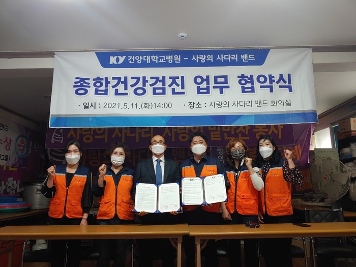 [대전=세계타임즈 이채봉 기자] 대전시 SNS 9천명 봉사단체 사랑의 사다리 밴드(리더 이정제)는 11일 오후2시, 건양대학교병원 헬쓰케어센터 김천수 부장의 진행으로 유희자 단장, 문정하 부단장, 강은정 사무국장, 김미옥 총무국장이 참석하여 건양대학교 병원과 업무협약을 체결 하였다.