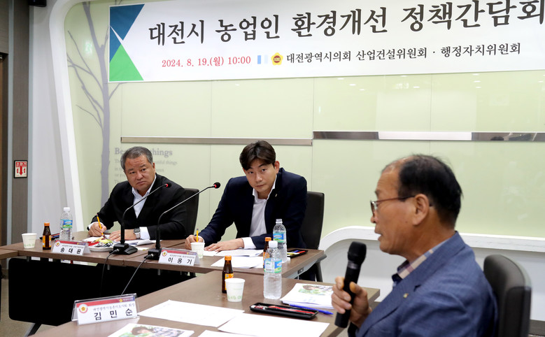 좌장을 맡은 송대윤 의원은 “대전은 3대 하천이 관통하고 계절적으로 농업에 적합한 환경을 갖추고 있지만 그린벨트가 많아 다양한 농업기반 시설 투자에 제약이 많아 품질 향상과 차별화 등의 특화된 농업 정책이 필요하다”고 강조하면서, “보다 나은 농업인 경영환경 개선을 위해 지역 농업인의 요구사항이 적극 반영될 수 있도록 정책 모니터링을 수시로 하겠다”고 말했다.