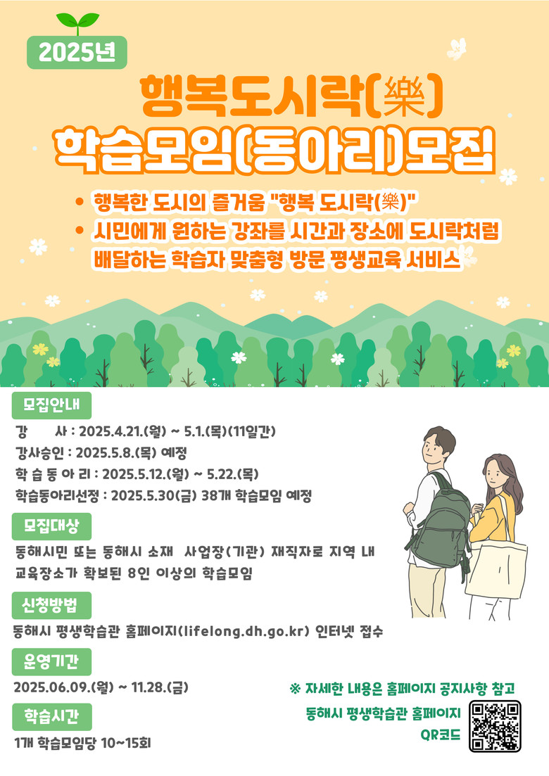 김은서 평생학습과장은 “행복도시락 강좌는 시간과 공간의 제약 없이 도시 곳곳에서 즐거운 배움이 실현되는 생활 밀착형 프로그램”이라며 “동해시 전역이 학습의 장이 되는 진정한 평생학습도시 구현을 위해 시민과 함께 성장하는 문화를 확산해 나가겠다”고 말했다.