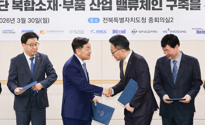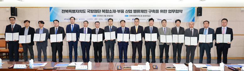 ○ 소재~완제품에 이르는 밸류체인 완성으로 앵커기업 투자유치 기대 [세계타임즈=전북 이상호 기자] 전북특별자치도는 30일 전주 탄소소재 국가산단을 거점으로 ‘국방 첨단복합소재·부품 산업 밸류체인’을 구축하기 위해 업무협약을 체결했다.