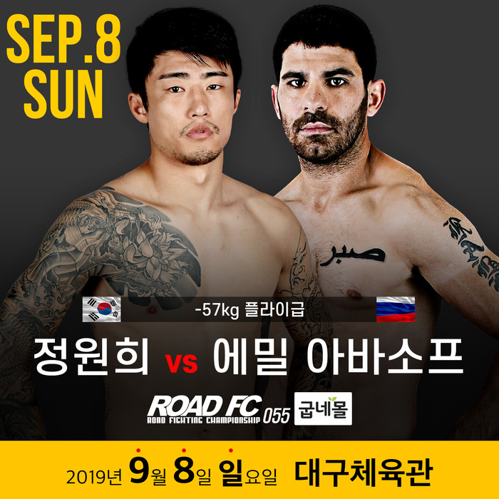 [세계타임즈 김인수기자] ROAD FC (로드FC) 9월 8일 대구체육관에서 굽네몰 ROAD FC 055를 개최, 정원희(27, KING DOM)와 에밀 아바소프(30, TEAM SABR)의 경기와 최우혁(29, 쎈짐)과 소얏트(26, 팀 타이혼 향남)의 대진이 확정됐다.