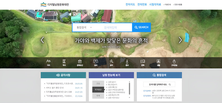 시는 한국학중앙연구원과 공동으로 추진한 「디지털남원문화대전」 수정증보 사업을 완료했다고 밝혔다. 「디지털남원문화대전」은 남원의 역사와 문화유산, 인물, 행정, 산업, 생활사 등 지역 전반의 정보를 온라인에 체계적으로 정리한 지역문화 종합정보 콘텐츠다. 2007년 처음 편찬된 뒤 시민과 연구자, 학생, 관광객 등이 폭넓게 활용해 온 대표적 디지털 향토문화 자료로, 누리집(namwon.grandculture.net)을 통해 누구나 확인할 수 있다.