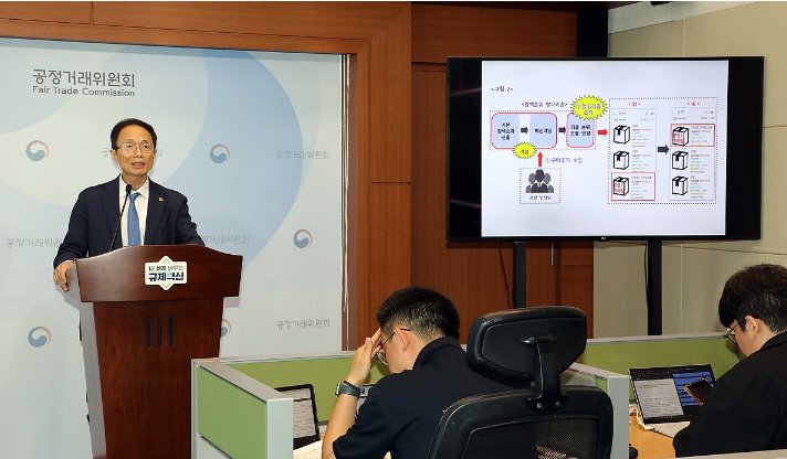 조홍선 공정거래위원회 부위원장이 13일 오전 정부세종청사 공정거래위 기자실에서 쿠팡㈜ 및 쿠팡㈜의 자체브랜드(PB)상품을 전담하여 납품하는 쿠팡의 100% 자회사인 씨피엘비㈜의 위계에 의한 고객유인행위에 대해 시정명령과 함께 과징금 1천4백억원(잠정)을 부과하고 각각 검찰에 고발하기로 결정했다고 밝히고 있다