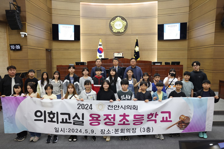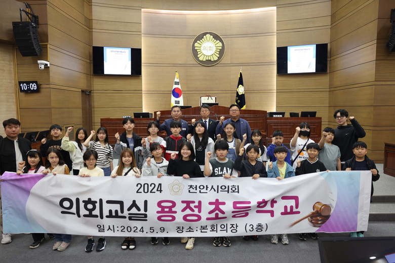[천안시 세계타임즈=백택기 기자] 천안시의회는 어린이 및 청소년들의 민주 시민으로서의 의식 성장을 위하여 꾸준히 교육 기회를 제공해 왔고, 2024년에도 의회교실 및 어린이의회 등을 진행한다. 그 첫 시작으로 5월 9일 풍세면 용청초등학교 5~6학년 학생들과 청소년·어린이 의회교실을 진행하였다.