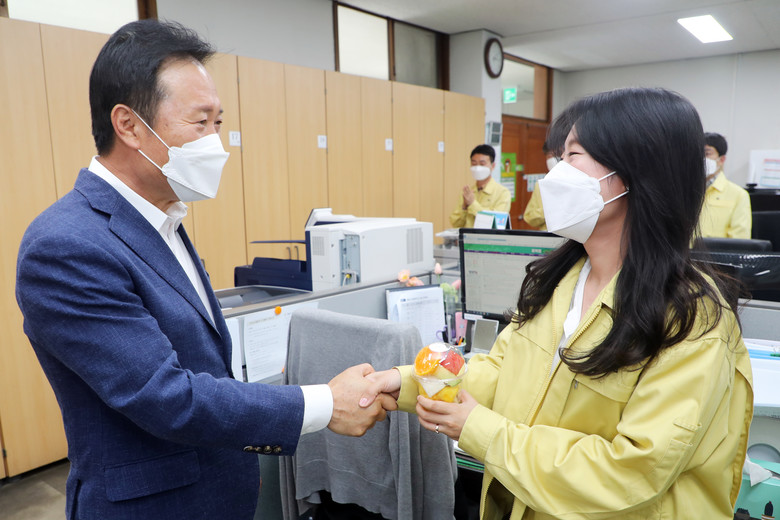 황 의장은 감염병관리과, 자연재난과, 사회재난과를 직접 방문하여 간식을 전달하고, 직원들의 애로사항을 듣고 그 동안의 노고에 대한 감사의 마음을 전했다.