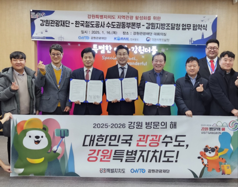 [강원도 세계타임즈=김민석 기자] 강원관광재단(대표이사 최성현)은 1월 16일, 코레일 수도권동부본부(본부장 김경재), 강원지방조달청(청장 이병철)과 함께 강원관광재단 대회의실에서 강원 지역관광 활성화를 위한 업무협약(MOU)을 체결했다고 밝혔다.