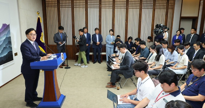 [세계타임즈 = 이채봉 기자] 우원식 국회의장은 공전을 거듭하는 제22대 국회 원(院) 구성 협상과 관련, 6월 임시국회 일정을 차질없이 지키도록 하겠다고 말했다.우 의장은 국회에서 기자회견을 열고 6월 임시국회에서 교섭단체 대표연설과 대정부질문 등을 원활하게 수행해야 한다. 여야가 빨리 합의를 해달라면서 이같이 밝혔다.우 의장이 원 구성 협상 마감 시한을 확실히 밝히지는 않았으나, 교섭단체 대표연설 등의 일정을 소화하겠다고 공언했다는 점에서 이번 주, 혹은 아무리 늦어도 6월 마지막 주인 다음 주 초반을 마지노선으로 보고 있는 것 아니냐는 분석이 나온다.만일 여야가 합의하지 않은 상황에서 우 의장이 시한 내 원 구성을 우선시해 야당 단독으로 본회의를 연다면 더불어민주당이 18개 상임위원회 위원장 자리를 모두 가져가게 된다.우 의장은 상임위원장 배분은 1당(민주당) 11개, 2당(국민의힘) 7개로 나누는 것이 합당하다. 민주당이 18개 상임위원장을 모두 맡는 것은 국민의힘을 지지한 국민들의 권리를 침해하는 것이라면서도 국회를 빨리 열어야 하는 절박한 이유가 넘친다. 이를 늦추는 것은 국민에 대한 권리 침해라고 강조했다.국민의힘을 향해 국정을 책임지는 집권 여당의 책임 있는 자세가 필요하다며 여당이 소수당이라는 사실이 책임을 덜어내는 이유가 되기는 어렵다고 지적했다.우 의장은 아울러 국회법에 따라 소집된 상임위원회에 국무위원이 불출석하는 것은 국회를 무시하는 행동이자 직무유기라고 비판했다.우 의장은 오후 4시 30분 국회의장실에서 국민의힘 추경호·민주당 박찬대 원내대표를 만나 원 구성 협상을 이어갈 계획이다.