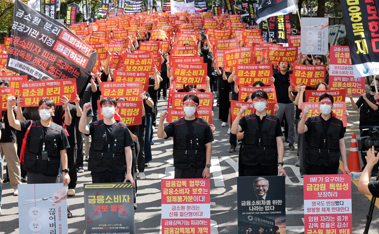 18일 서울 영등포구 여의도 국회의사당역 앞에서 열린 금융감독원 금융소비자보호원 분리 및 금융감독원 공공기관 지정 반대 집회에서 금감원 노동조합원들이 구호를 외치고 있다. 2025.9.18