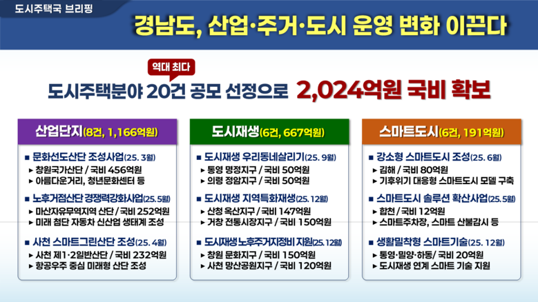 특히, 산업단지, 도시재생, 스마트 도시 등 경남의 도시 구조와 산업 경쟁력을 중장기적으로 개선할 핵심 분야에서 국비를 집중적으로 확보했다는 점에서 의미가 크다.