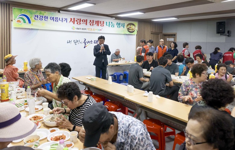어르신들의 건강한 여름나기를 기원하고, 지역 내 이웃 간 온정을 나누기 위해 마련된 이번 행사는 복지만두레 회원들이 기획부터 조리, 배식까지 직접 참여해 정성스럽게 준비한 삼계탕과 다과를 제공했다.