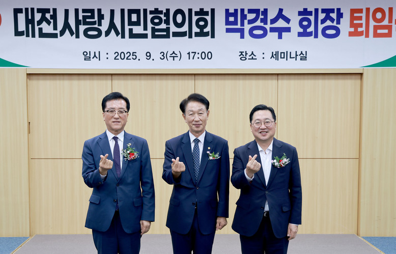 조원휘 의장은 “지난 2023년 9월, 제11대 회장으로 취임하신 박경수 회장은 재임하는 동안 취약계층 나눔, 안전 캠페인, 대전 0시 축제 자원봉사 등 시민 역량을 결집하며 밝은 대전을 만들기 위해 노력해 오셨다”면서, “회장님의 퇴임에 아쉬움도 크지만, 대전을 위해 최선을 다해 오신 점에 대해 깊은 감사를 전하고, 앞으로도 대전이 더 따뜻하고 행복한 도시가 될 수 있도록 대전사랑시민협의회가 대전의 든든한 버팀목이 되어 왕성한 활동을 이어가길 진심으로 기원한다”고 말했다.