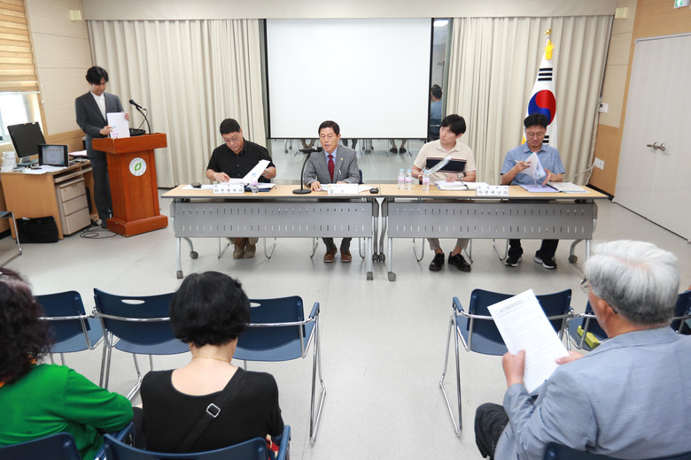 이번 공청회는 ‘율량천 홍수방어벽(이하 차수벽) 설치 방식 주민 의견 합의’를 위한 것으로 충청북도 및 청주시 사업 관계자들과 사천동 통장 등 주민 50명이 참석했다.