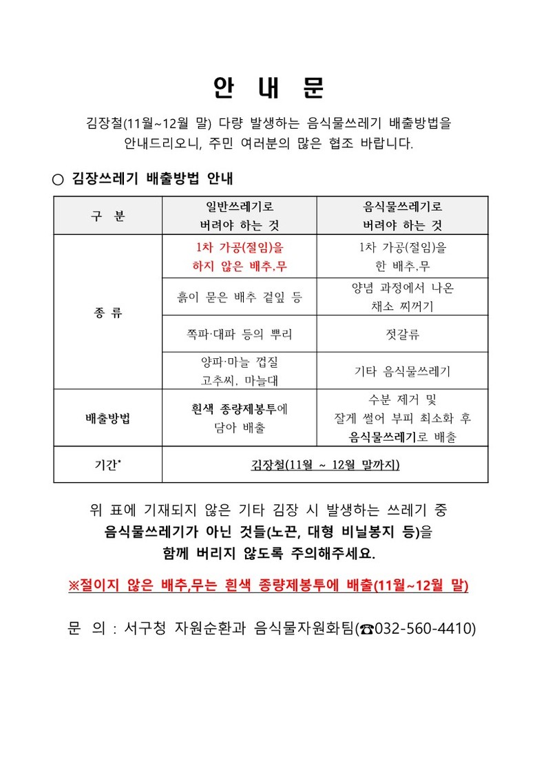 서구 관계자는 “김장철 다량 발생하는 김장쓰레기의 올바른 배출 방법을 적극적으로 홍보하여 김장쓰레기 수거에 차질이 없도록 하겠다”라며, “해당 기간이 지나면 혼합배출로 과태료가 부과될 수 있으니 주의하시길 바란다”라고 당부했다.