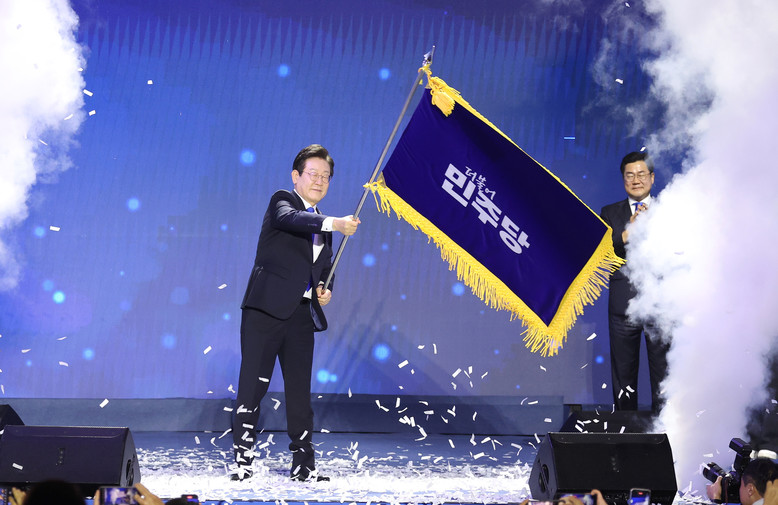 [세계타임즈 = 심귀영 기자] 더불어민주당 당대표 연임에 성공한 이재명 신임 당대표가 18일 오후 서울 송파구 올림픽공원 KSPO돔에서 열린 전국당원대회에서 박찬대 대표 직무대행 겸 원내대표로부터 전달받은 당기를 흔들고 있다. 2024.8.18