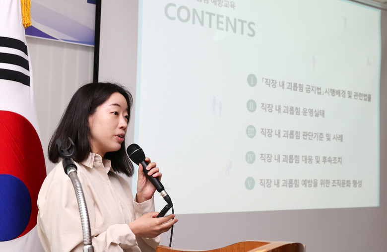 이번 교육은 한국고용노동교육원 전문 강사인 민정은 고도노무사사무소 대표 노무사의 진행으로 직장 내 괴롭힘의 시대적 배경부터 유형과 판단기준, 대응 및 후속 조치뿐 아니라 괴롭힘 예방을 위한 다양한 프로그램까지 종합적으로 다뤄졌다.