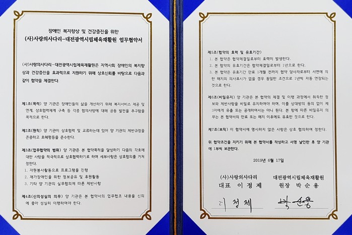 [대전=세계타임즈 이장성 기자] 따뜻한 나눔을 꾸준히 실천하고 있는 대전광역시 SNS 봉사단체 사단법인 사랑의 사다리 밴드(리더 이정제)는 17일, 오후14시 대덕구 대화동에 위치한 대전광역시립체육재활원(원장 박순용)에서 장애인 복지향상 및 건강증진을 위한 업무협약식을 체결하였다.