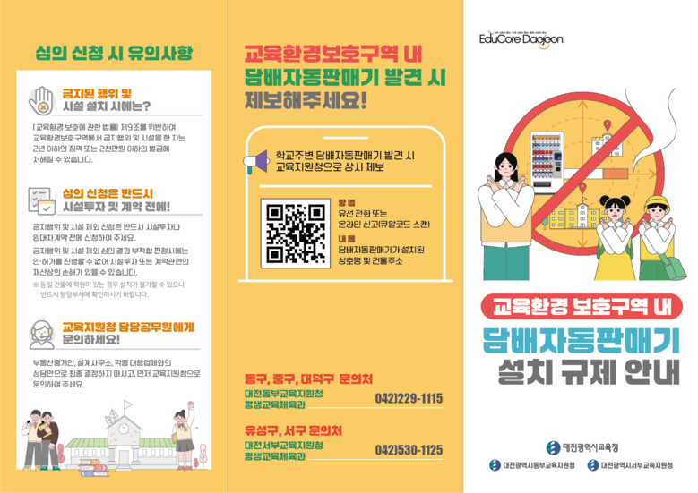 대전시교육청은 시민들의 적극적인 참여를 위해 큐알코드가 포함된 안내 리플릿을 제작하고, 유관기관과 전자담배 판매업소 등에 배포하여 법 개정 사항을 널리 알릴 예정이다.