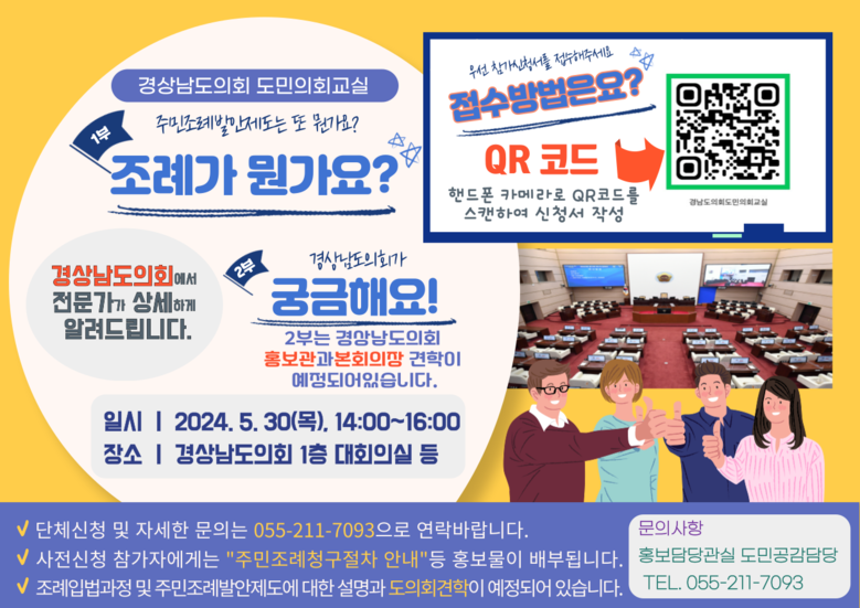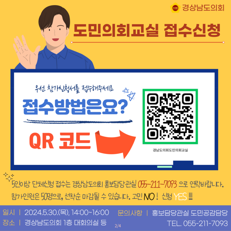 참가접수는 QR코드를 통해 네이버폼으로 사전등록신청이 가능하며 단체신청은 도의회 홍보담당관실(☏055-211-7093)로 연락하면 관련 서류를 안내받을 수 있다.