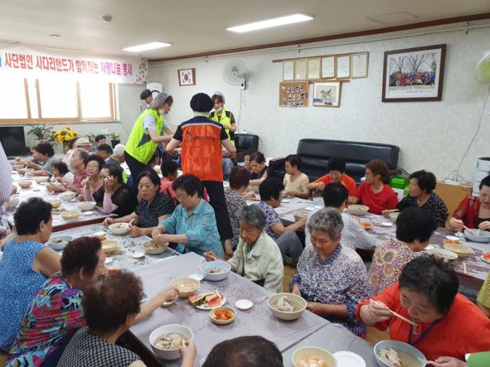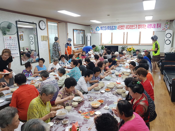 [대전=세계타임즈 이장성 기자] 대전시 소외계층을 위해서 다양한 봉사활동을 실천하고 있는 대전시 SNS 8천명 봉사단체 사단법인 사랑의 사다리 밴드(리더 이정제)는 16일, 오전11시, 중리종합사회복지관(관장 신이원)에서 으뜸새마을금고(이사장 이희각)의 후원으로 법1동 경로당 200분의 어르신들 점심시간에 삼계탕 봉사로 사회적 효행을 실천 하였다.