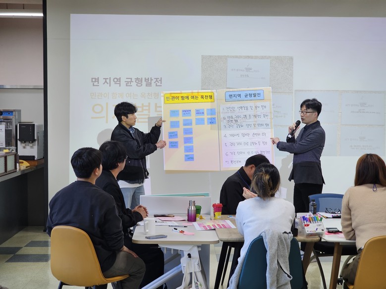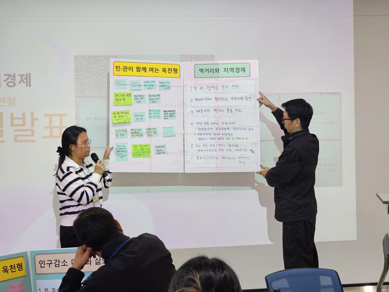 이날 워크숍 토론 테이블은 △면 지역 균형발전 △먹거리와 지역경제 △환경ㆍ생태ㆍ관광 △인구감소 대응과 주민 삶의 질이라는 네 개 부문으로 구성되었다. 각 테이블에 참여한 사회적경제조직 현장 활동가와 관련 부서 공무원들은 해당 부문에 있어 서로의 활동과 생각을 나누고 지속가능 옥천 발전을 위한 공동 의제를 토론하는 뜻깊은 시간을 가졌다.