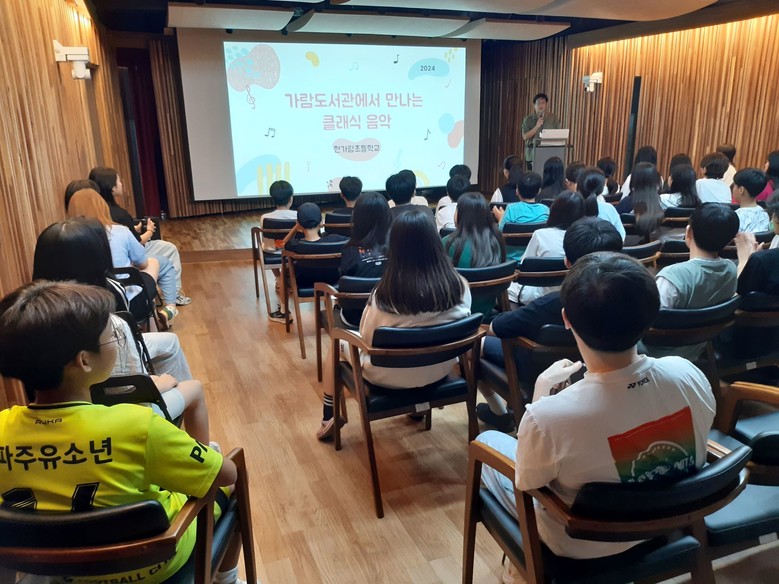 [파주시 세계타임즈=송민수 기자] 한가람초(교장 이강수)는 2024년 6월 13일(목)부터 6월 27일(목)까지 6학년 학생들을 대상으로 클래식 특화 가람도서관 현장체험학습을 진행하였다. 이번 현장체험학습은 가람도서관과 MOU체결로 이루어졌으며, 한가람초의 학교자율과제인 독서와 문화예술교육을 융합한 프로그램으로 기획되어 학생들에게 책과 클래식 음악의 아름다움과 가치를 전달하기 위해 마련된 특별한 프로그램이었다.