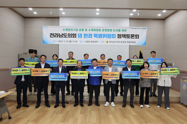 전남도의회 댐 환경 특별위원회는 정영균 위원장(순천1), 김호진 부위원장(나주1), 강정일(광양2), 강문성(여수3), 박문옥(목포3), 김재철(보성1), 류기준(화순2), 정철(장성1), 김주웅(비례), 박원종(영광1) 의원 등 10명으로 구성·운영 중으로, 댐 주변지역 지원법률 개정 촉구 건의안 및 댐 주변지역 지원사업 기준완화 촉구 건의안을 발의해 댐 주변지역 주민들의 복지 향상과 관련 규제 완화를 위한 의정활동에 온 힘을 다하고 있다.