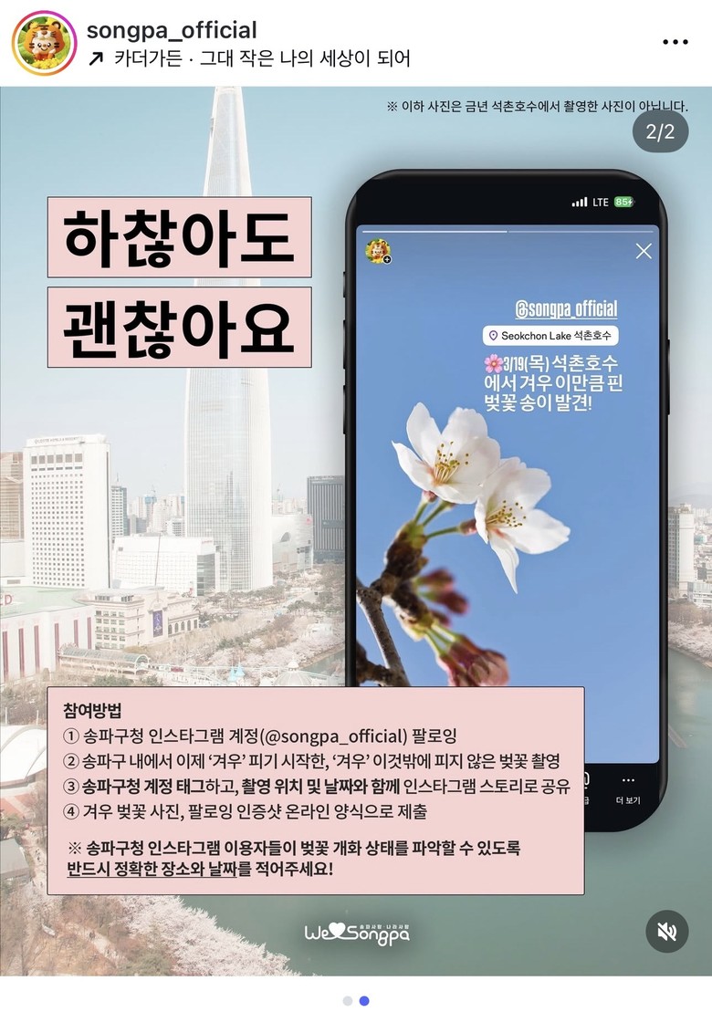 이 밖에도 송파구 내 초기 벚꽃 개화 현황을 구민이 직접 제보하는 ▲‘겨우 벚꽃 이벤트’를 3월 29까지 진행하고, 만개 시즌에는 ▲‘벚꽃 하트 사진 이벤트’도 진행할 계획이다.