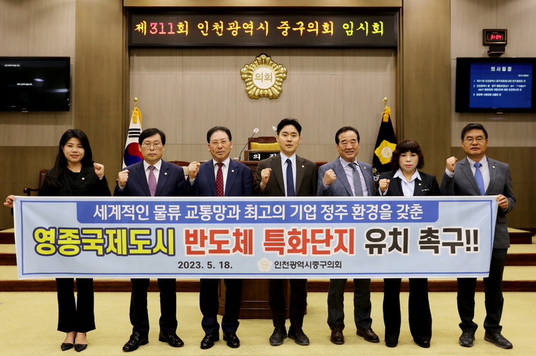 [중구 세계타임즈=심하린 기자] 중구의회(의장 강후공)는 18일 본회의장에서 ‘반도체 특화단지 영종국제도시 유치’를 촉구하는 성명서를 발표했다.