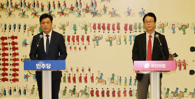 [세계타임즈 = 신상철 기자] 국민의힘 곽규택, 더불어민주당 조승래(왼쪽) 수석대변인이 1일 오후 국회에서 채상병 특검법, 금융투자소득세 폐지, 전 국민 25만원 지원법 등을 논의한 여야 대표 회담 결과를 브리핑하고 있다. 2024.9.1
