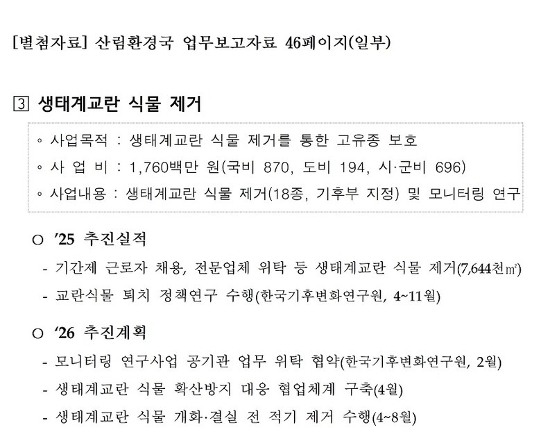 박길선 의원은 ‘생태계교란 식물 제거는 단순히 잡초를 없애는 것이 아니라, 우리 토종 생태계를 지키기 위한 필수적인 조치’라며, ‘매년 수행 중인 정책연구 결과와 제거 실적을 바탕으로 실효성 있는 방제 작업을 진행하여, 도민 불편이 없도록 사업이 완전히 마무리되어야 한다.’라고 강조했다.