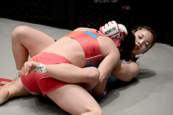 2라운드에도 그라운드 싸움이 이어졌다. 하지만 막상막하였던 1라운드와 달리 이예지는 밑에 깔려 아무 것도 해보지 못했다.