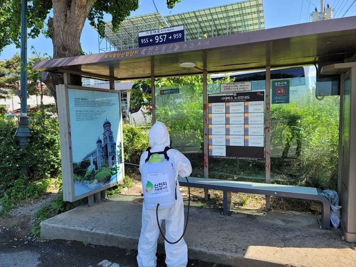 [세계타임즈 최준필 기자] 자원봉사단은 코로나19 감염 예방을 위해 승강장 의자, 내·외부 유리면과 안내 표지판 등과 주변을 깨끗하게 청소한 뒤 방역기를 이용해 방역 소독 활동을 진행했다.