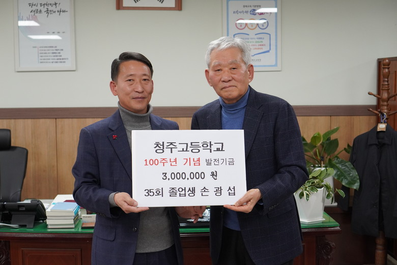 [충북 세계타임즈=이현진 기자] 청주고등학교(교장 지성훈)가 지난 2일(화), 교장실에서 손광섭 광진건설㈜ 대표가 학교발전기금 300만원을 기탁했다고 밝혔다.