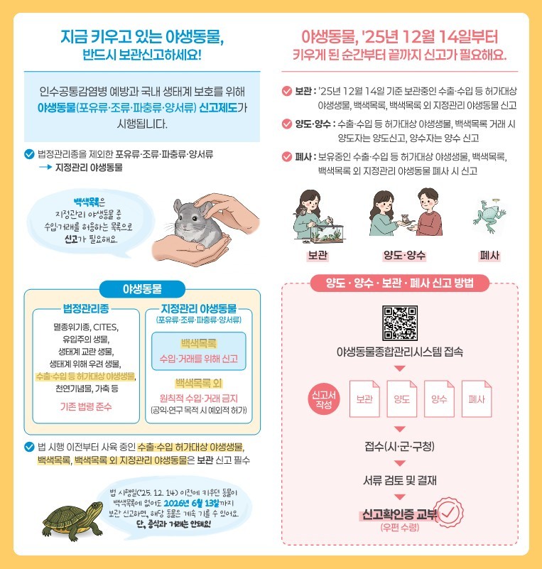 세부 내용을 살펴보면 주민이 기르는데 신고해야 하는 야생동물은 수출(반출) 또는 수입(반입) 시 허가를 받아야 하는 야생동물과 백색 목록에 해당하는 지정관리 야생동물이며 양도.양수, 보관, 폐사 시 관할 시군에 신고해야 한다.