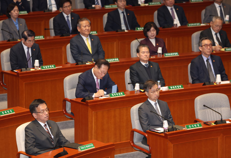민주당은 이들에 대한 탄핵소추안을 이날 본회의에서 보고한 다음 4일 본회의에서 표결에 부치겠다는 계획이다.국민의힘은 거대 야당의 광기 어린 탄핵 폭주라며 강력히 반발했지만, 역시 소수 여당의 한계에 국회 의결 절차를 막기 어려운 처지다.감사원장·검사 탄핵안이 가결된다면 정국이 한층 냉각되면서 예산안 처리에도 여파가 미칠 것이란 전망도 나온다.우 의장은 정기국회가 끝나는 오는 10일까지는 예산안을 처리해야 한다고 당부했지만, 현재로서는 처리 전망이 매우 불투명한 상황이다.국회는 지난해에도 법정 기한을 19일 넘겨 12월 21일이 돼서야 예산안을 처리했다. 이는 2014년 국회 선진화법 도입 이후 2022년(12월 24일)에 이어 두 번째로 늦은 기록이었다.