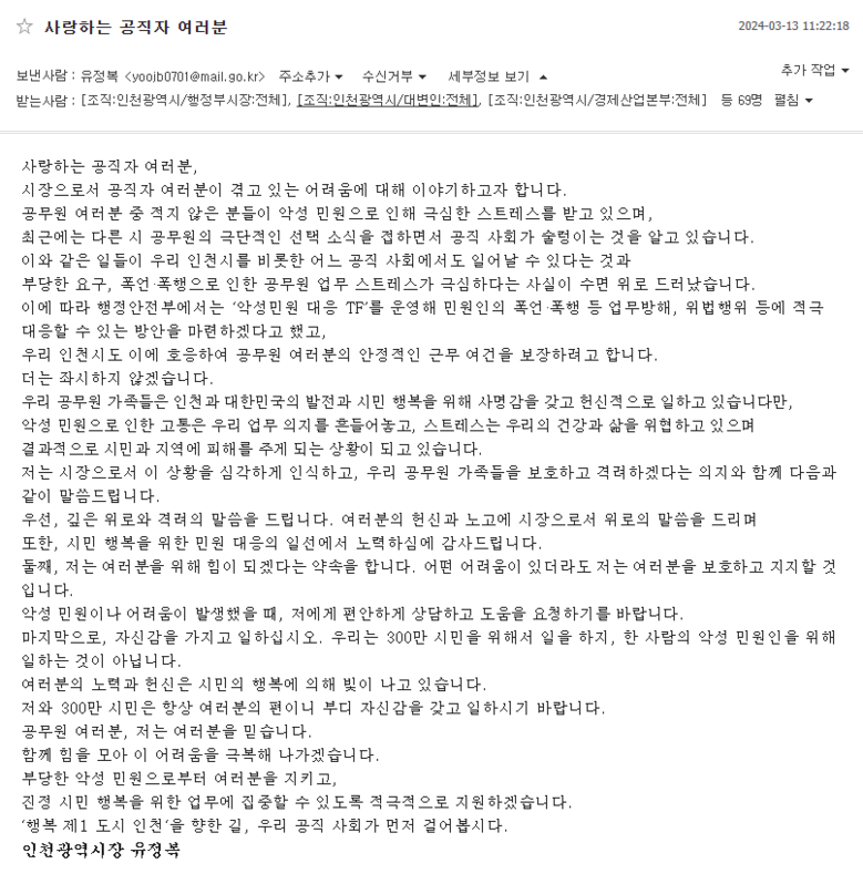 이메일에서 유 시장은 “공무원 여러분 중 적지 않은 분들이 악성 민원으로 인해 극심한 스트레스를 받고 있으며, 최근에는 다른 시 공무원의 극단적인 선택 소식을 접하면서 공직사회가 술렁이는 것을 알고 있다”고 운을 뗐다.