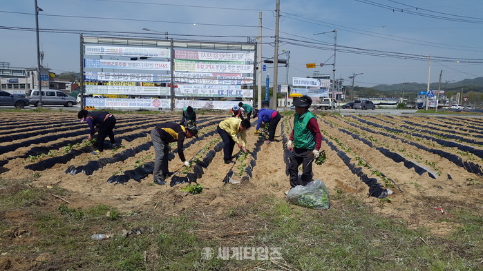 [충주=세계타임즈 이현진 기자] 충주시 대소원면 남녀 새마을협의회(회장 윤명규, 노현숙)가 27일 행복한 나눔과 따뜻한 이웃사랑 실천을 위해 1500㎡의 밭에 고구마를 식재하며 구슬땀을 흘렸다.