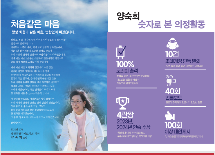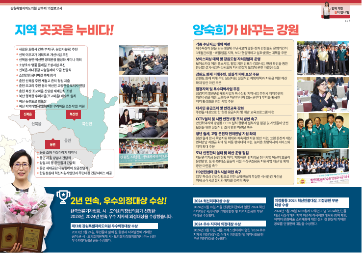 [강원도 세계타임즈=김민석 기자] 양숙희 강원특별자치도의원(안전건설위, 춘천6)은 10월 10일(목) 강원특별자치도의원 중 최초로 의정보고서를 제작 완료하고 조만간 지역주민들에게 배포할 계획”이라고 밝혔다.