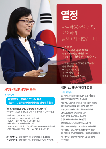 양의원은 “지난 7월 1일, 정치자금법 개정 이후 전국 최초로 지방의원 후원회 설립을 위해 등록 접수한 이후 의정보고서 제작을 꾸준하게 준비해 왔다. 이번 의정보고서 제작과 배포에 드는 비용 또한 당연히 후원회비로 충당할 것”이라면서 “지방의원 후원회 설립 취지에 맞게 정치자금의 투명성과 깨끗한 지방자치 활성화에 기여하는 모범 사례로 남기고 싶다”는 의견을 피력하였다.