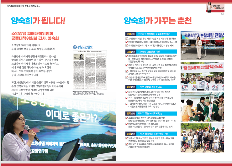 양숙희의원 의정보고서는 전반기 2년간의 의정활동을 마무리하는 시점에서 기간의 활동을 점검ㆍ정리함으로써 후반기 의정활동에 대한 계획을 치밀하게 수립하고 더욱 박차를 가하기 위해 제작하였다. 8페이지로 구성된 의정보고서는 인사말과 함께 각 페이지 별 컨셒으로 ‘숫자로 본 의정활동’ ‘양숙희가 뜁니다’ ‘양숙희가 가꾸는 춘천’ ‘지역 곳곳을 누비다’ ‘양숙희가 바꾸는 강원’으로 구성되어 있다.