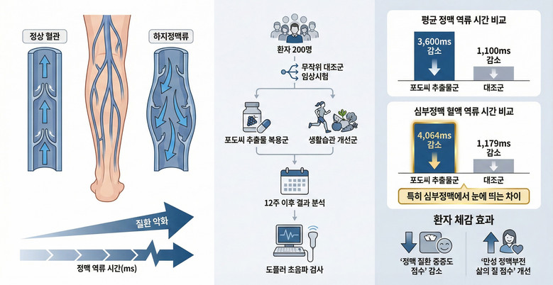 그 결과, 포도씨 추출물 복용군의 평균 정맥 역류 시간은 약 3,600ms 감소한 반면, 대조군은 약 1,100ms 감소에 그치며 통계적으로 유의한 차이를 보였다.