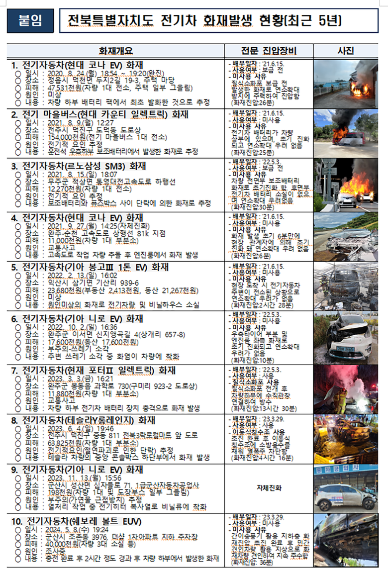 [전북특별자치도의회=세계타임즈 이상호 기자] 전국적으로 전기차 화재로 인해 전기차 충전시설에 대한 불안감이 확산되고 있고, 전북특별자치도 또한 최근 5년 동안 10건의 전기차 화재가 발생했 다. 이러한 상황 속에서 전북특별자치도의회 김이재 의원(전주제4선거구)은 전기차 화재 대응 대책을 마련하고자 ‘전기자동차 전용주차구역의 화재예방 및 안전시설 지원에 관한 조례’ 제정을 추진한다.