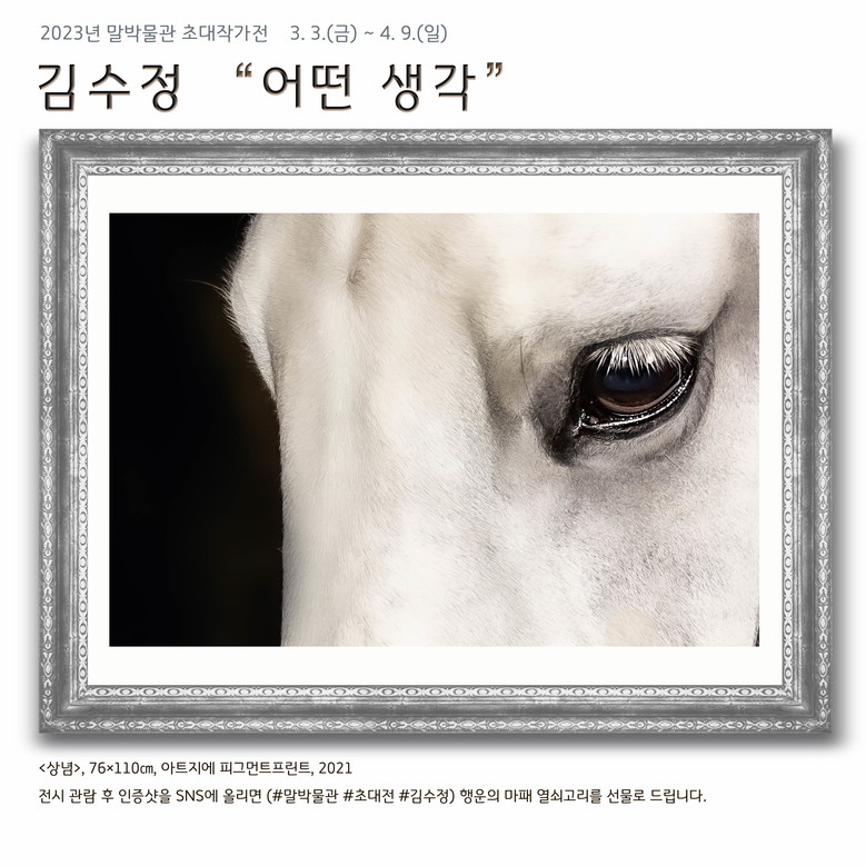 김수정 작가의 ‘어떤 생각’전시는 4월 9일까지 렛츠런파크 서울에 위치한 말박물관 기획전시실에서 관람할 수 있다. 관람시간은 오전10시부터 오후 5시30분 까지며 매주 월요일은 정기 휴관이다.