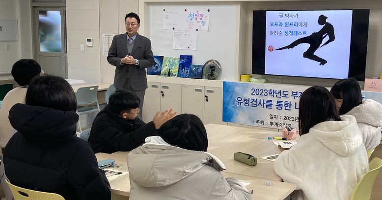 이어서 ‘유형검사를 통한 나 바로 알기’를 주제로, 놀이로 배우는 자신의 강점 및 내가 가장 흥미롭고 잘 할 수 있는 지능 찾기 등의 활동을 통해 학생들의 자존감을 높이고 진로 설계를 위한 기초 역량을 함양하는 시간을 가졌다.